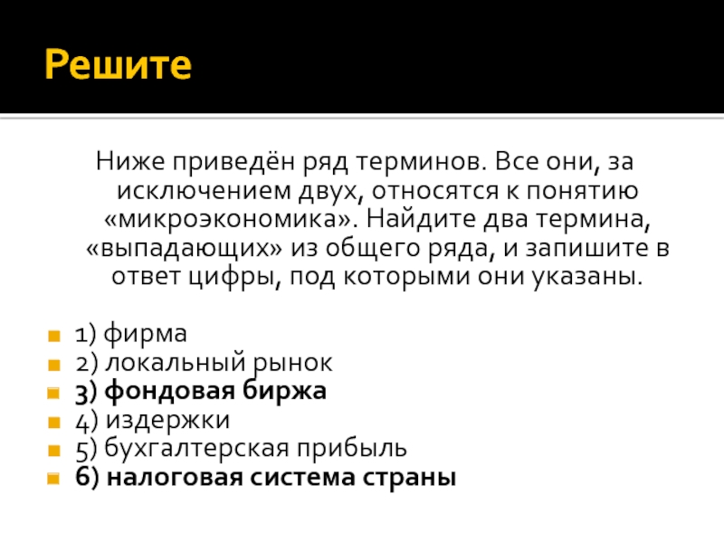 понятию «микроэкономика». Найдите два термина, «выпадающих» из общего ряда, и запишите в ответ цифры, под которыми они указаны.