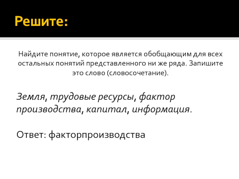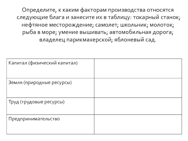 Слайд 21Определите, к каким факторам производства относятся следующие блага и занесите их