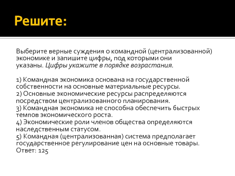 Выберите верные суждения о командной (централизованной) экономике и запишите цифры, под