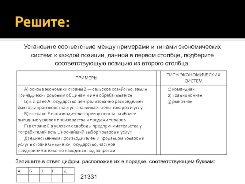 Установите соответствие между примерами и типами экономических систем: к каждой позиции,