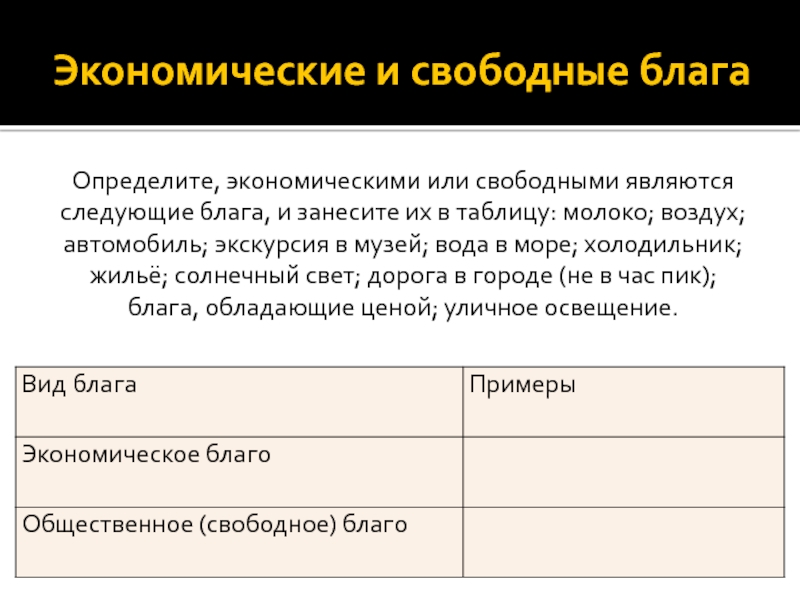 занесите их в таблицу: молоко; воздух; автомобиль; экскурсия в музей; вода в море; холодильник; жильё; солнечный свет; дорога в городе (не в час пик); блага, обладающие ценой; уличное освещение.