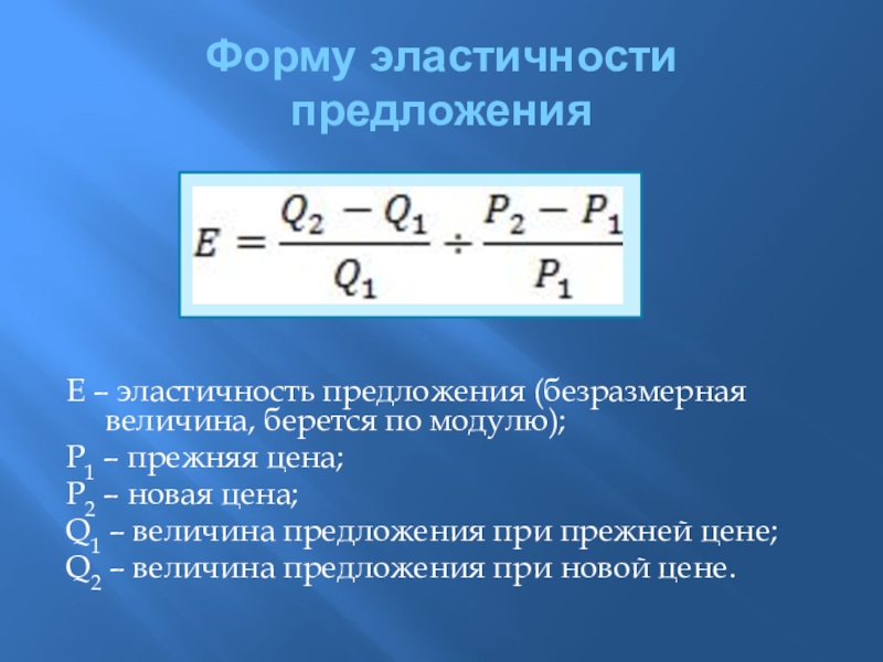 Форму эластичности предложенияE – эластичность предложения (безразмерная величина, берется по модулю);Р1 – прежняя цена;Р2 – новая цена;Q1