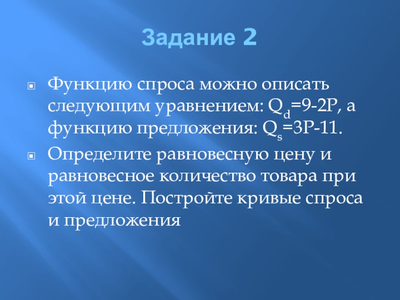 Задание 2Функцию спроса можно описать следующим уравнением: Qd=9-2P, а функцию предложения: Qs=3P-11.Определите равновесную цену и равновесное количество