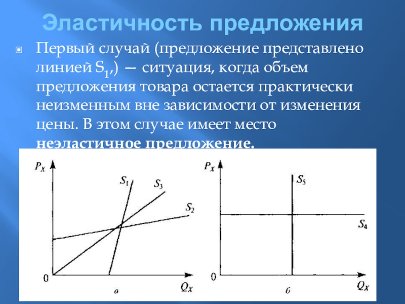 Эластичность предложенияПервый случай (предложение представлено линией S1,) — ситуация, когда объем предложения товара остается практически неизменным вне
