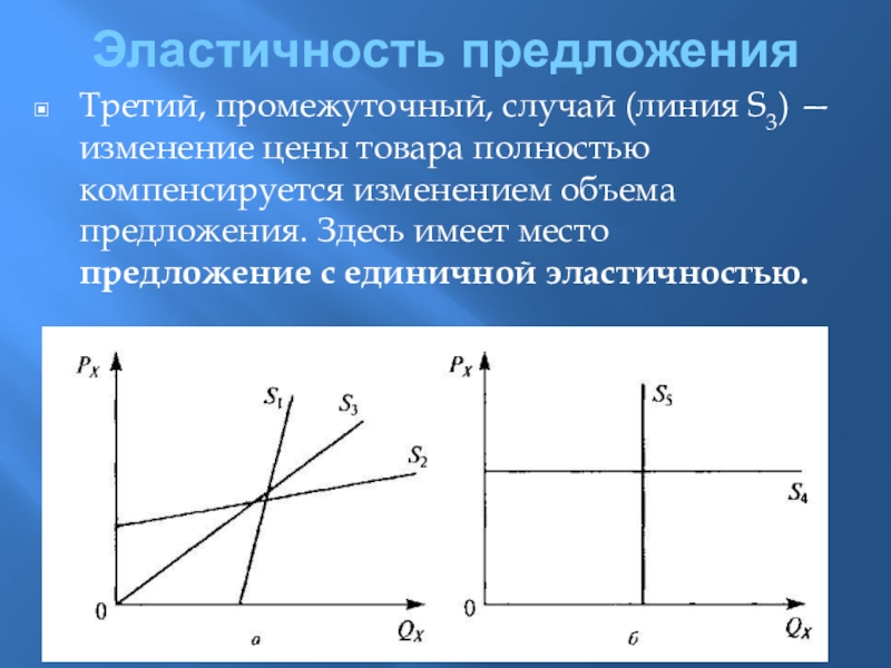 Эластичность предложенияТретий, промежуточный, случай (линия S3) — изменение цены товара полностью компенсируется изменением объема предложения. Здесь имеет