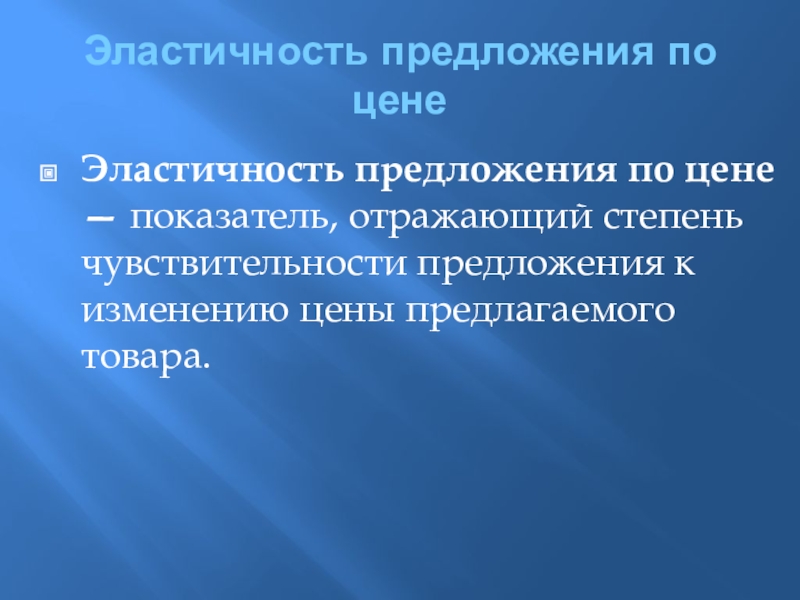 Эластичность предложения по ценеЭластичность предложения по цене — показатель, отражающий степень чувствительности предложения к изменению цены предлагаемого товара.
