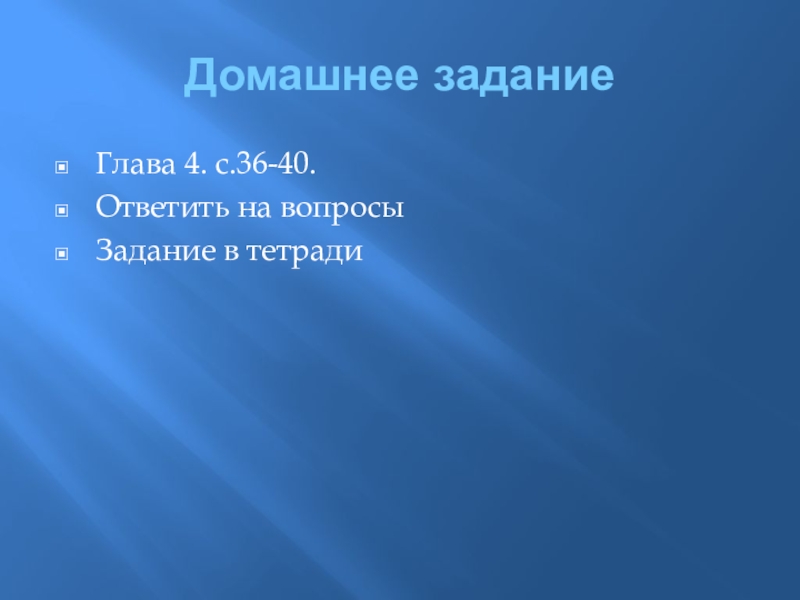 Домашнее заданиеГлава 4. с.36-40.Ответить на вопросыЗадание в тетради