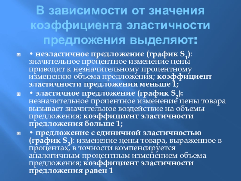 Слайд 7В зависимости от значения коэффициента эластичности предложения выделяют:
