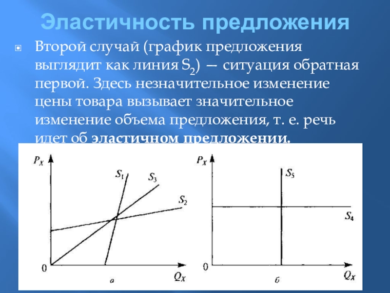 Эластичность предложенияВторой случай (график предложения выглядит как линия S2) — ситуация обратная первой. Здесь незначительное изменение цены