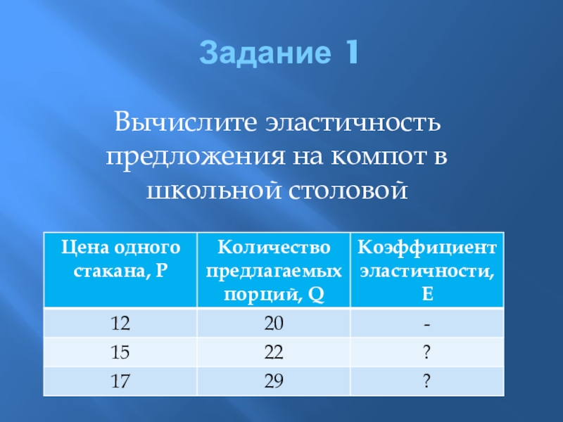 Задание 1Вычислите эластичность предложения на компот в школьной столовой