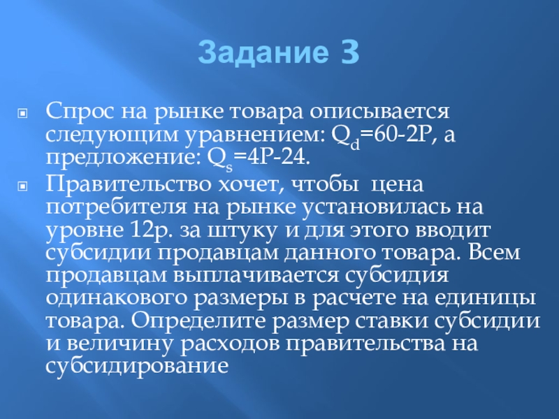 Задание 3Спрос на рынке товара описывается следующим уравнением: Qd=60-2P, а предложение: Qs=4P-24.Правительство хочет, чтобы цена потребителя на