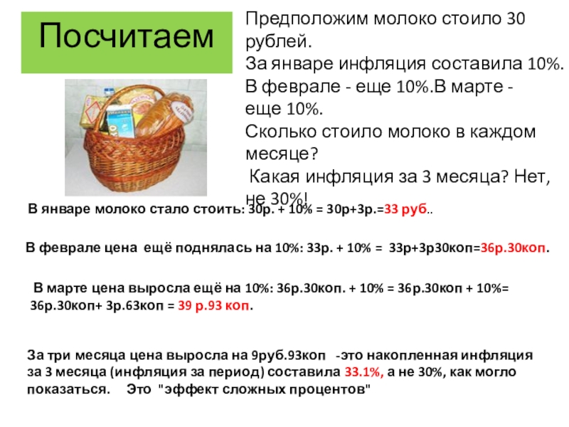 За три месяца цена выросла на 9руб.93коп -это накопленная инфляция за 3 месяца (инфляция за период) составила 33.1%, а не 30%, как могло показаться. Это "эффект сложных процентов"