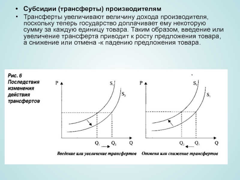 ему некоторую сумму за каждую единицу товара. Таким образом, введение или увеличение трансферта приводит к росту предложения товара, а снижение или отмена -к падению предложения товара.