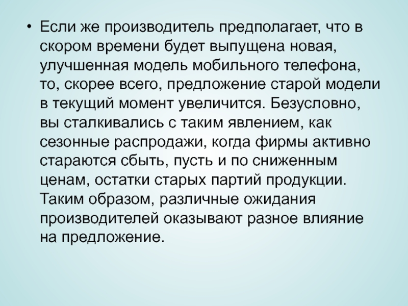 улучшенная модель мобильного телефона, то, скорее всего, предложение старой модели в текущий момент увеличится. Безусловно, вы сталкивались с таким явлением, как сезонные распродажи, когда фирмы активно стараются сбыть, пусть и по сниженным ценам, остатки старых партий продукции. Таким образом, различные ожидания производителей оказывают разное влияние на предложение.