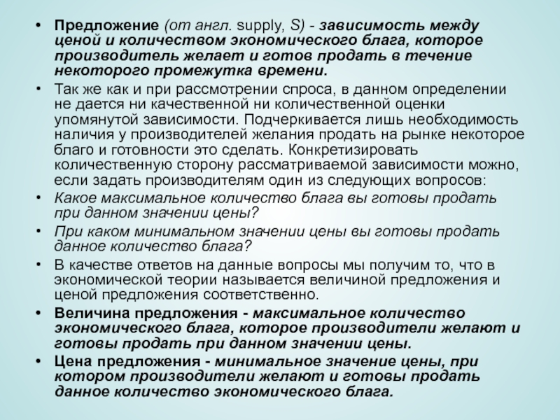 Слайд 2Предложение (от англ. supply, S) - зависимость между ценой и количеством
