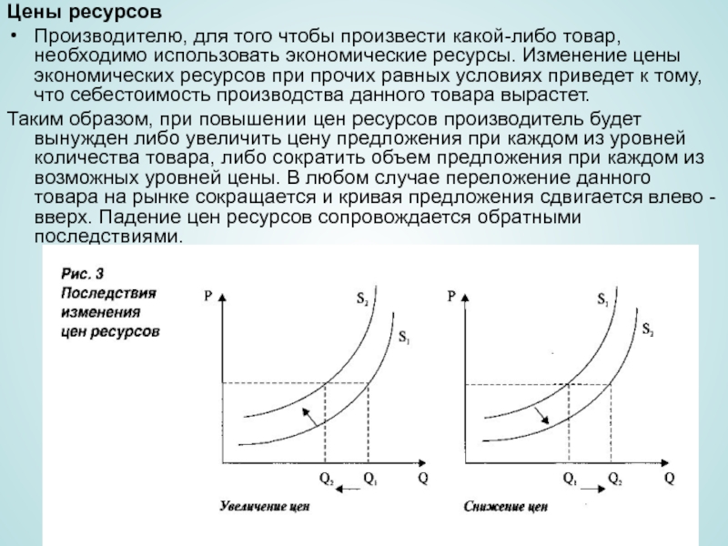 ресурсы. Изменение цены экономических ресурсов при прочих равных условиях приведет к тому, что себестоимость производства данного товара вырастет.