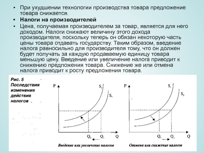 производителем за товар, является для него доходом. Налоги снижают величину этого дохода производителя, поскольку теперь он обязан некоторую часть цены товара отдавать государству. Таким образом, введение налога равносильно для производителя тому, что он должен будет получать за каждую продаваемую единицу товара меньшую цену. Введение или увеличение налога приводит к снижению предложения товара. Снижение же или отмена налога приводит к росту предложения товара.