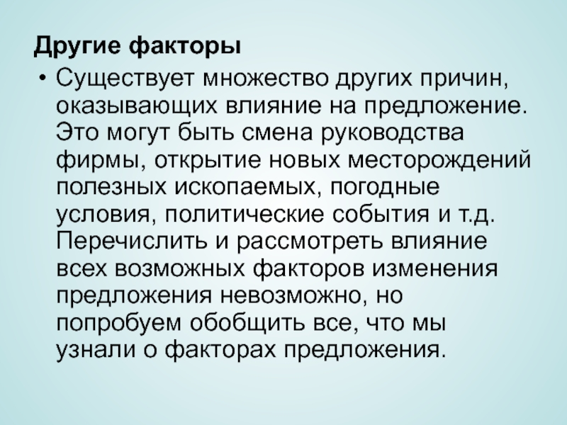 Существует множество других причин, оказывающих влияние на предложение. Это могут