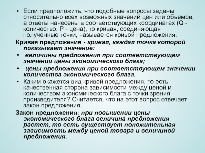 Каким окажется вид кривой предложения, то есть качественная сторона зависимости между ценой и количеством экономического блага с точки зрения производителя? Считается, что на этот вопрос отвечает закон предложения.