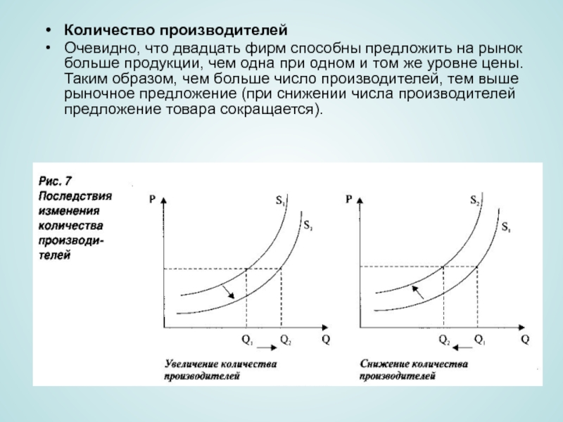 чем одна при одном и том же уровне цены. Таким образом, чем больше число производителей, тем выше рыночное предложение (при снижении числа производителей предложение товара сокращается).