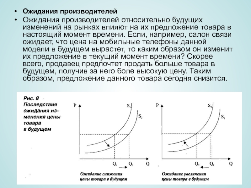 предложение товара в настоящий момент времени. Если, например, салон связи ожидает, что цена на мобильные телефоны данной модели в будущем вырастет, то каким образом он изменит их предложение в текущий момент времени? Скорее всего, продавец предпочтет продать больше товара в будущем, получив за него боле высокую цену. Таким образом, предложение данного товара сегодня снизится.