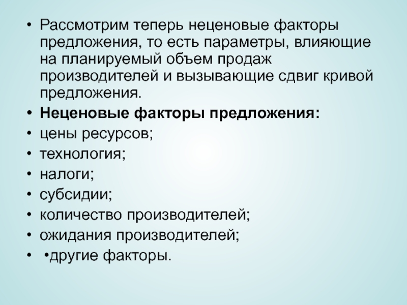 Слайд 7Рассмотрим теперь неценовые факторы предложения, то есть параметры, влияющие на планируемый