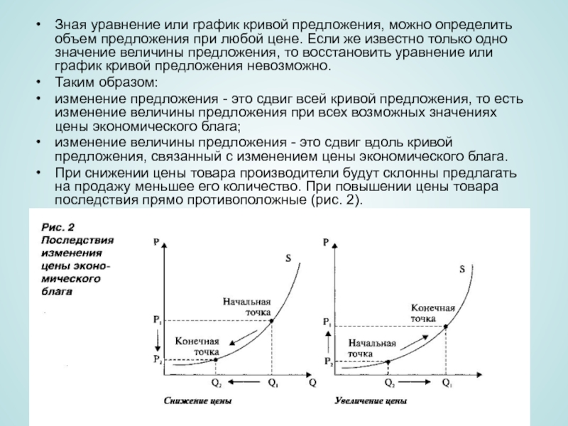 любой цене. Если же известно только одно значение величины предложения, то восстановить уравнение или график кривой предложения невозможно.