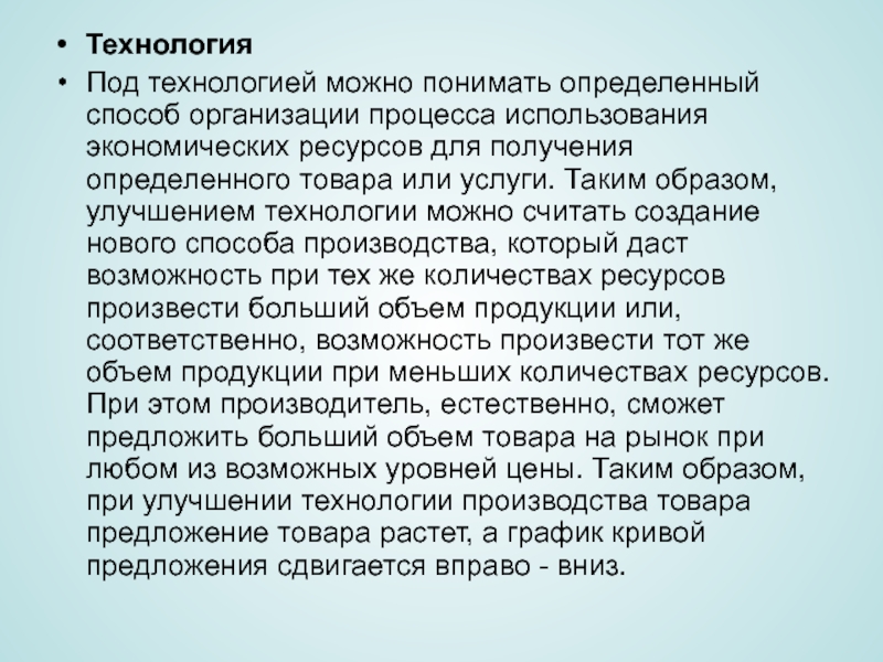 для получения определенного товара или услуги. Таким образом, улучшением технологии можно считать создание нового способа производства, который даст возможность при тех же количествах ресурсов произвести больший объем продукции или, соответственно, возможность произвести тот же объем продукции при меньших количествах ресурсов. При этом производитель, естественно, сможет предложить больший объем товара на рынок при любом из возможных уровней цены. Таким образом, при улучшении технологии производства товара предложение товара растет, а график кривой предложения сдвигается вправо - вниз.