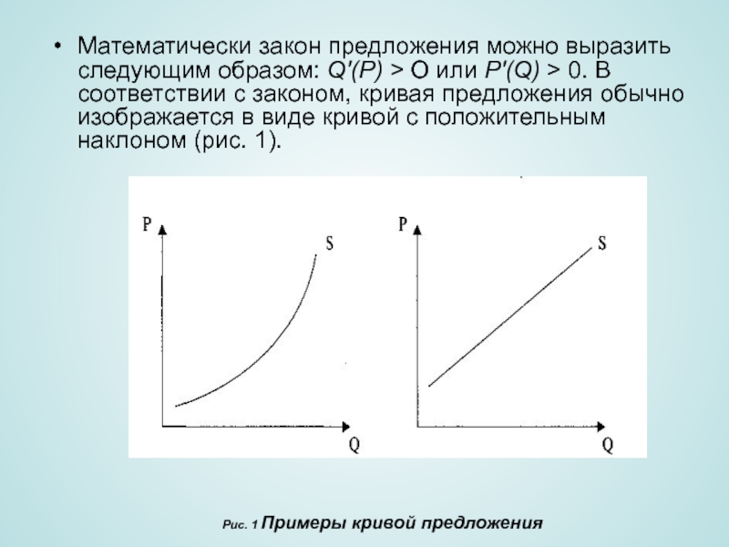Слайд 4Математически закон предложения можно выразить следующим образом: Q'(P) > О или