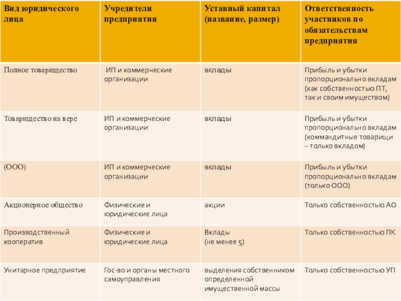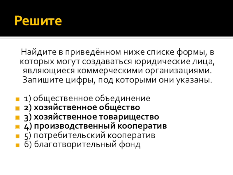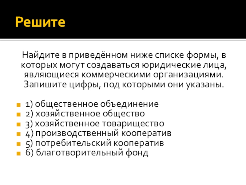 Найдите в приведённом ниже списке формы, в которых могут создаваться юридические