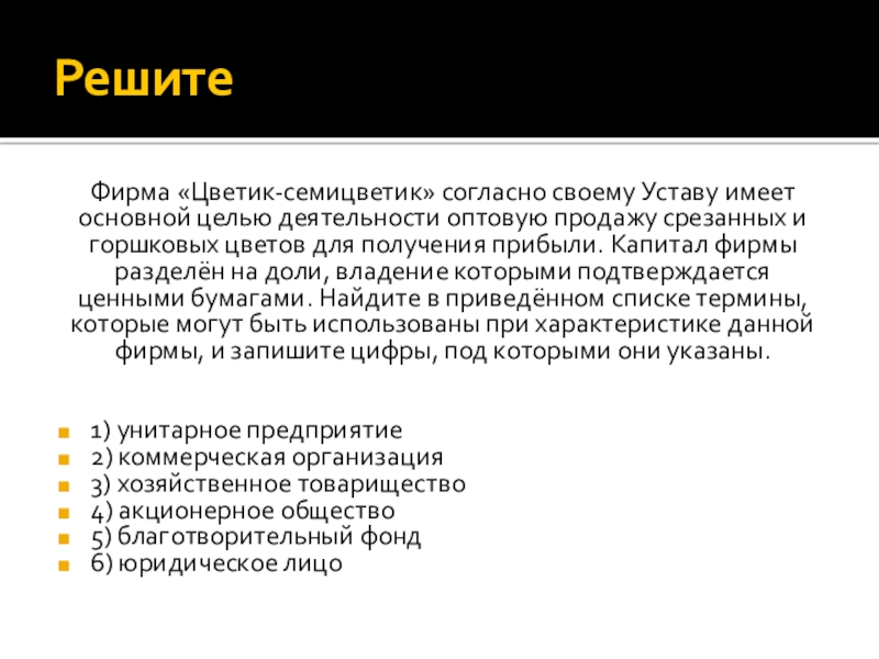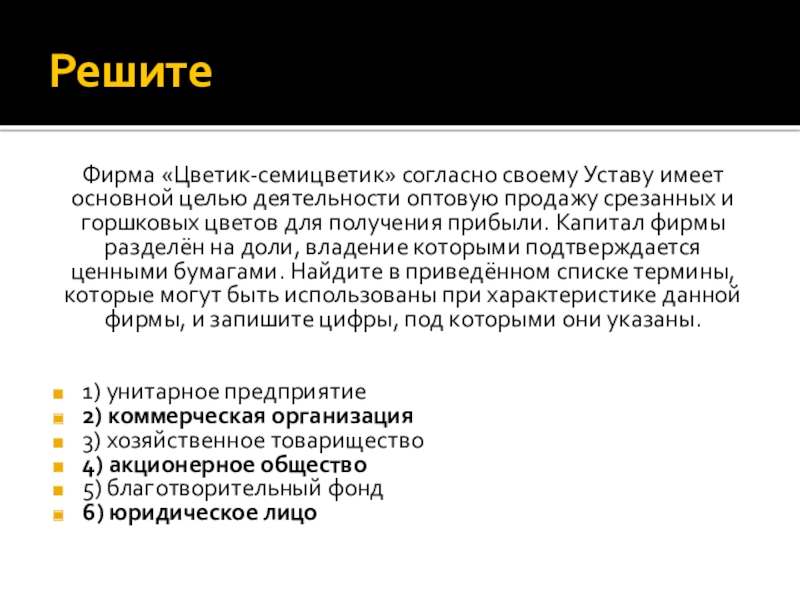 срезанных и горшковых цветов для получения прибыли. Капитал фирмы разделён на доли, владение которыми подтверждается ценными бумагами. Найдите в приведённом списке термины, которые могут быть использованы при характеристике данной фирмы, и запишите цифры, под которыми они указаны.