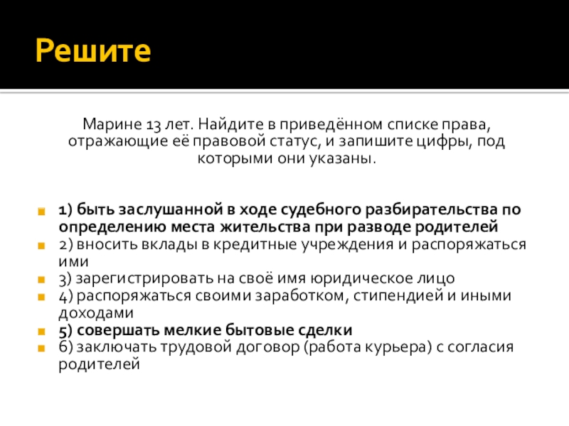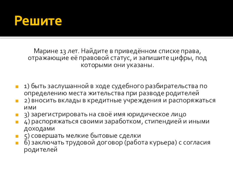 Марине 13 лет. Найдите в приведённом списке права, отражающие её правовой