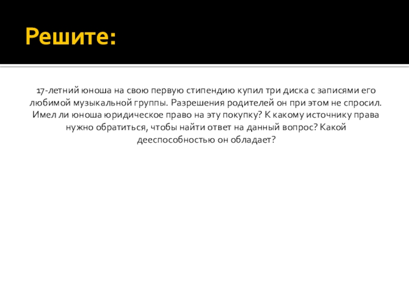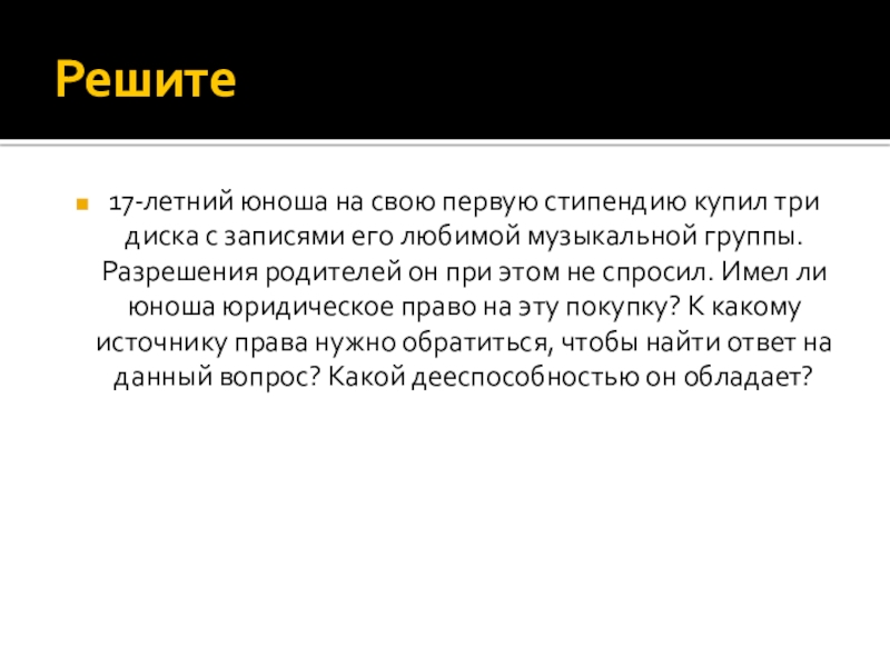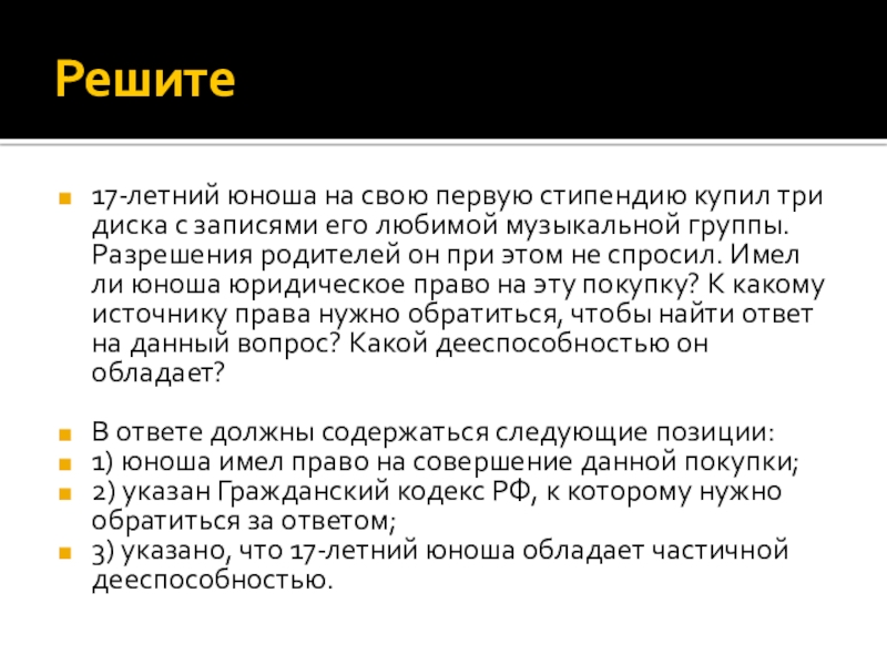 его любимой музыкальной группы. Разрешения родителей он при этом не спросил. Имел ли юноша юридическое право на эту покупку? К какому источнику права нужно обратиться, чтобы найти ответ на данный вопрос? Какой дееспособностью он обладает?