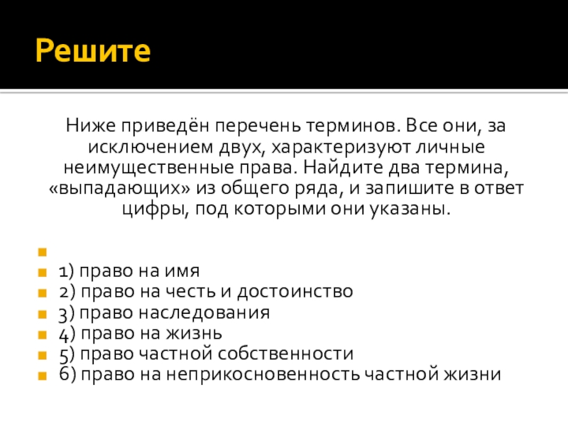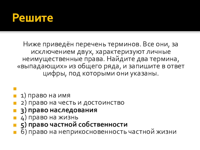 неимущественные права. Найдите два термина, «выпадающих» из общего ряда, и запишите в ответ цифры, под которыми они указаны.