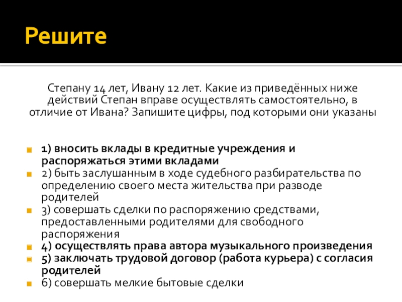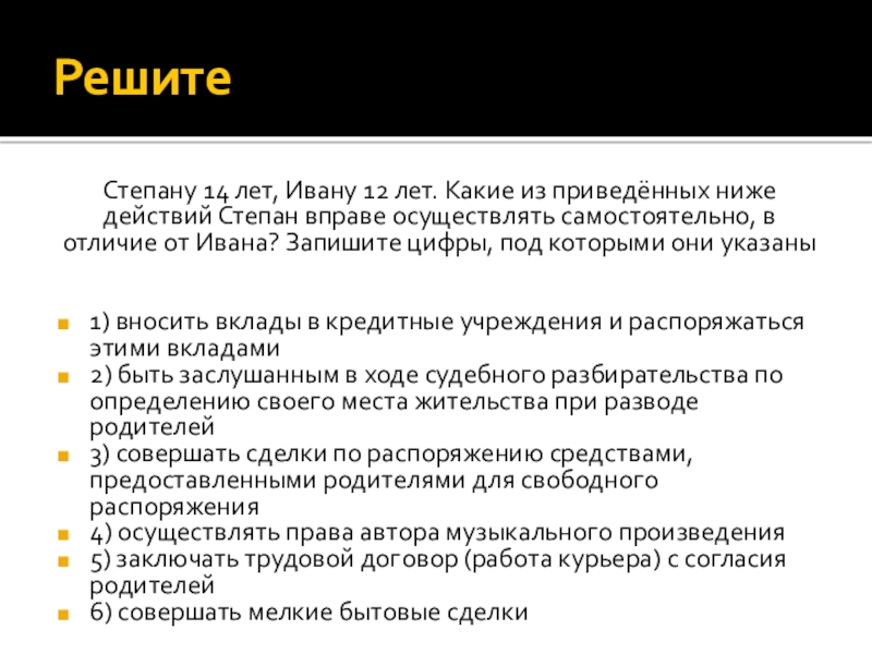 Степан вправе осуществлять самостоятельно, в отличие от Ивана? Запишите цифры, под которыми они указаны