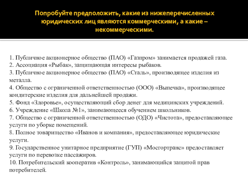 Слайд 18Попробуйте предположить, какие из нижеперечисленных юридических лиц являются коммерческими, а какие
