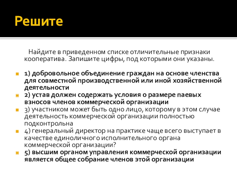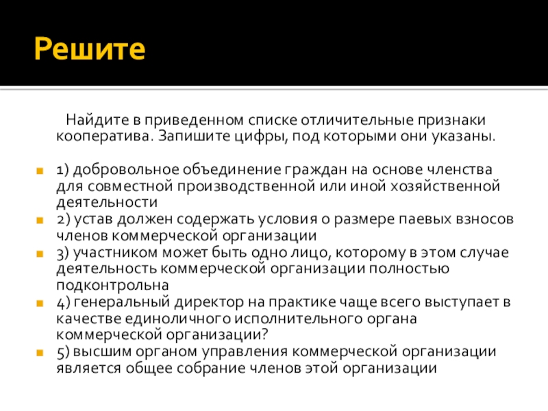 Найдите в приведенном списке отличительные признаки кооператива. Запишите цифры, под которыми