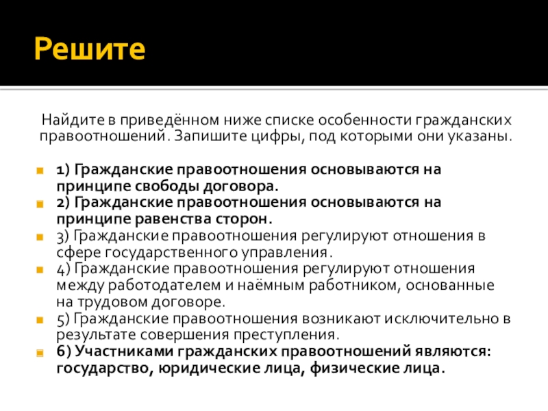Найдите в приведённом ниже списке особенности гражданских правоотношений. Запишите цифры, под
