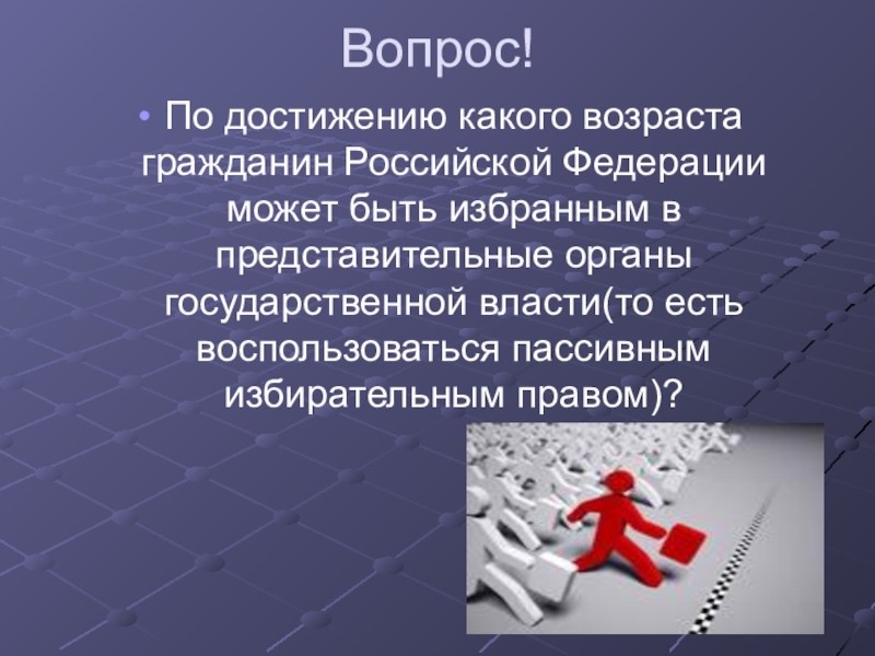 Вопрос!По достижению какого возраста гражданин Российской Федерации может быть избранным в представительные органы государственной власти(то есть воспользоваться