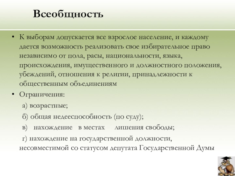 свое избирательное право независимо от пола, расы, национальности, языка, происхождения, имущественного и должностного положения, убеждений, отношения к религии, принадлежности к общественным объединениям