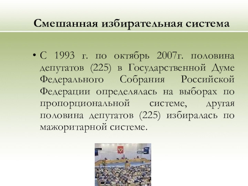 (225) в Государственной Думе Федерального Собрания Российской Федерации определялась на выборах по пропорциональной системе, другая половина депутатов (225) избиралась по мажоритарной системе.