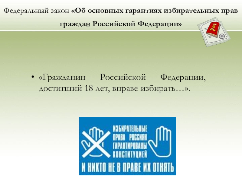 Слайд 4Федеральный закон «Об основных гарантиях избирательных прав граждан Российской Федерации»