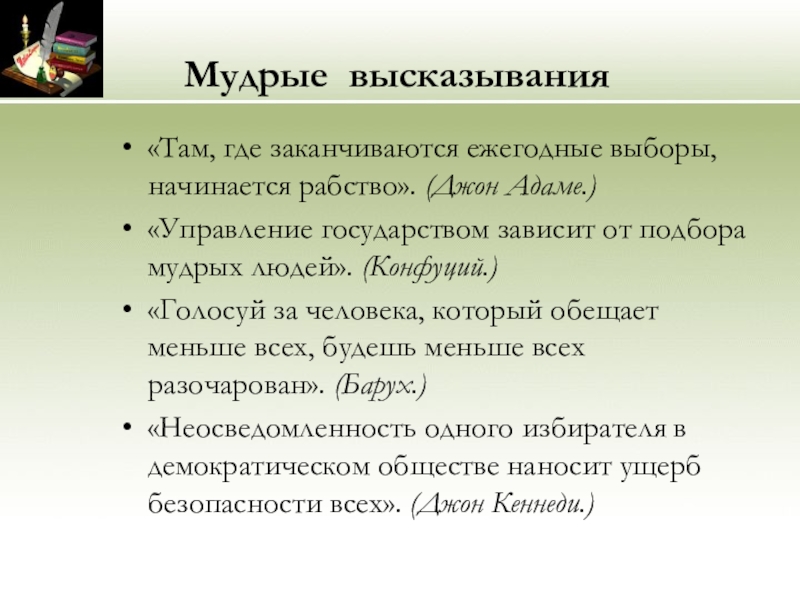 «Там, где заканчиваются ежегодные выборы, начинается рабство». (Джон Адаме.)