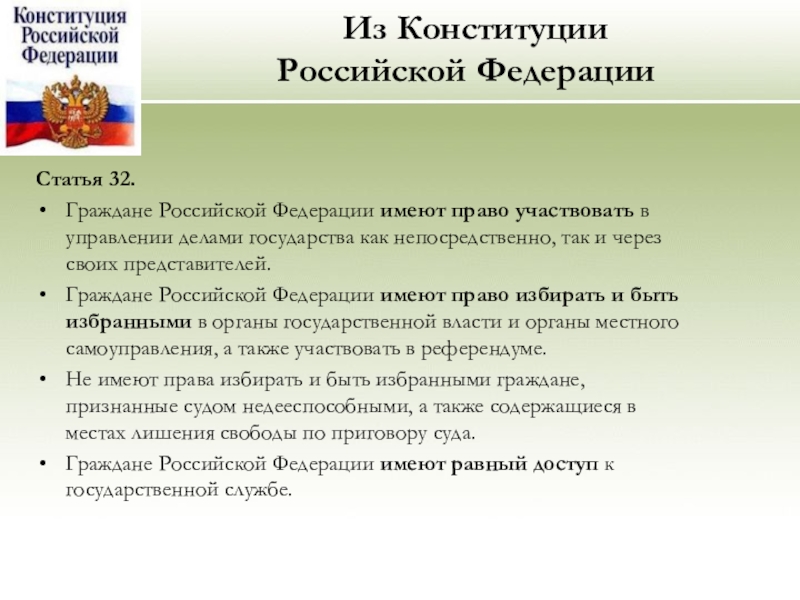 Граждане Российской Федерации имеют право избирать и быть избранными в органы государственной власти и органы местного самоуправления, а также участвовать в референдуме.