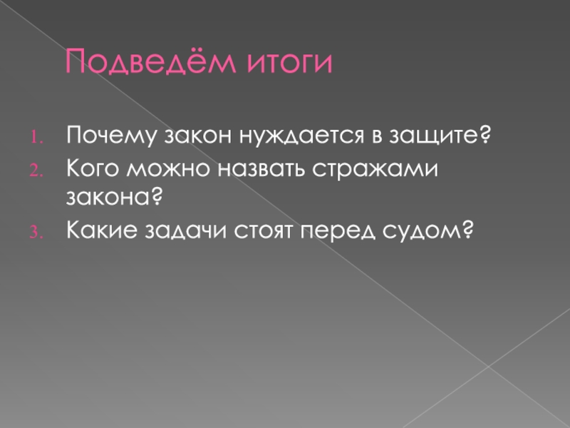 Подведём итогиПочему закон нуждается в защите?Кого можно назвать стражами закона?Какие задачи стоят перед судом?