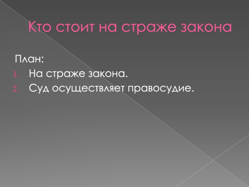 Кто стоит на страже законаПлан:На страже закона.Суд осуществляет правосудие.