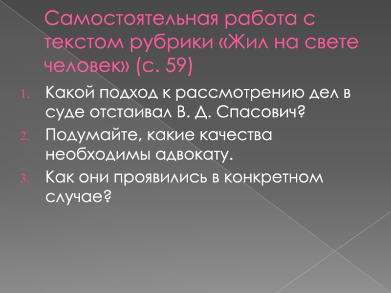 Самостоятельная работа с текстом рубрики «Жил на свете человек» (с. 59)Какой подход к рассмотрению дел в суде