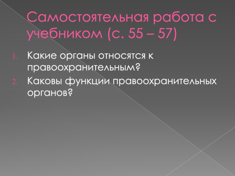 Самостоятельная работа с учебником (с. 55 – 57)Какие органы относятся к правоохранительным?Каковы функции правоохранительных органов?