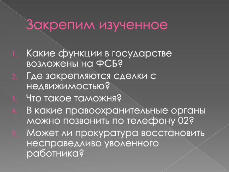 Закрепим изученноеКакие функции в государстве возложены на ФСБ?Где закрепляются сделки с недвижимостью?Что такое таможня?В какие правоохранительные органы