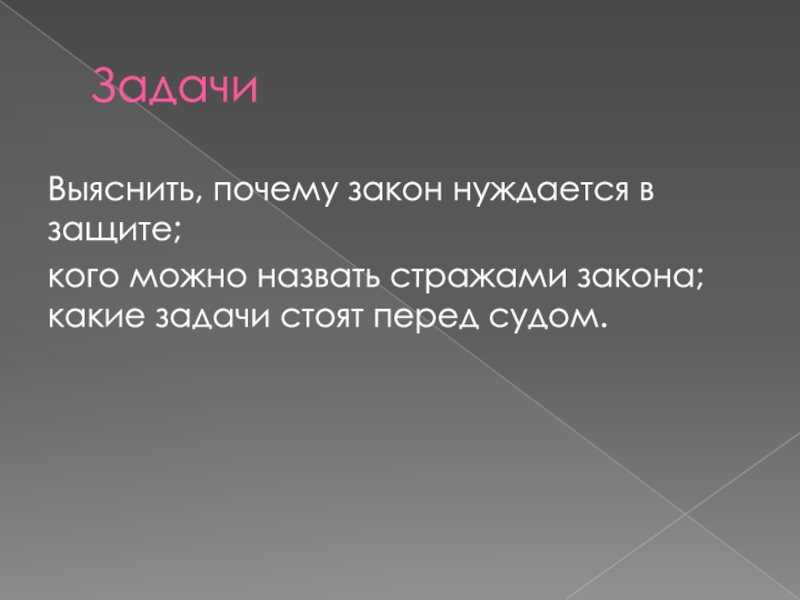 Задачи Выяснить, почему закон нуждается в защите;кого можно назвать стражами закона; какие задачи стоят перед судом.